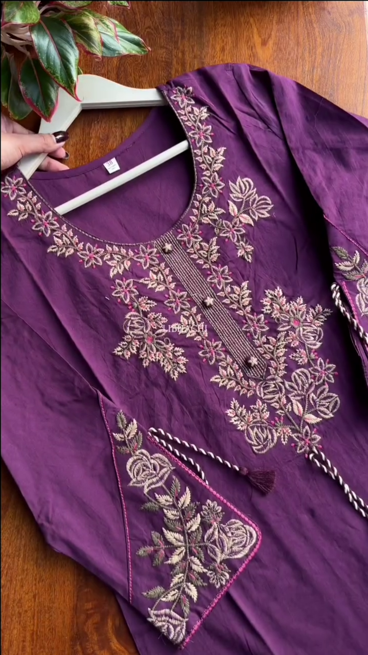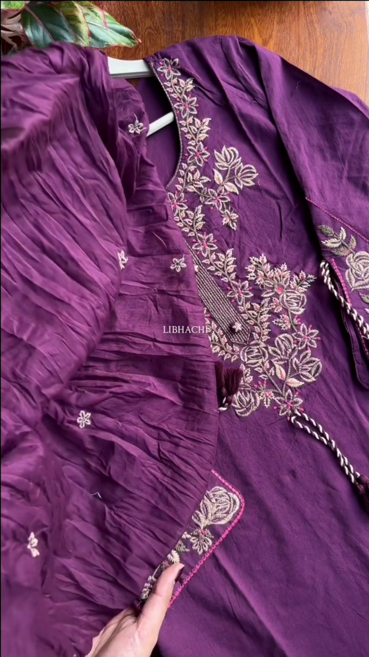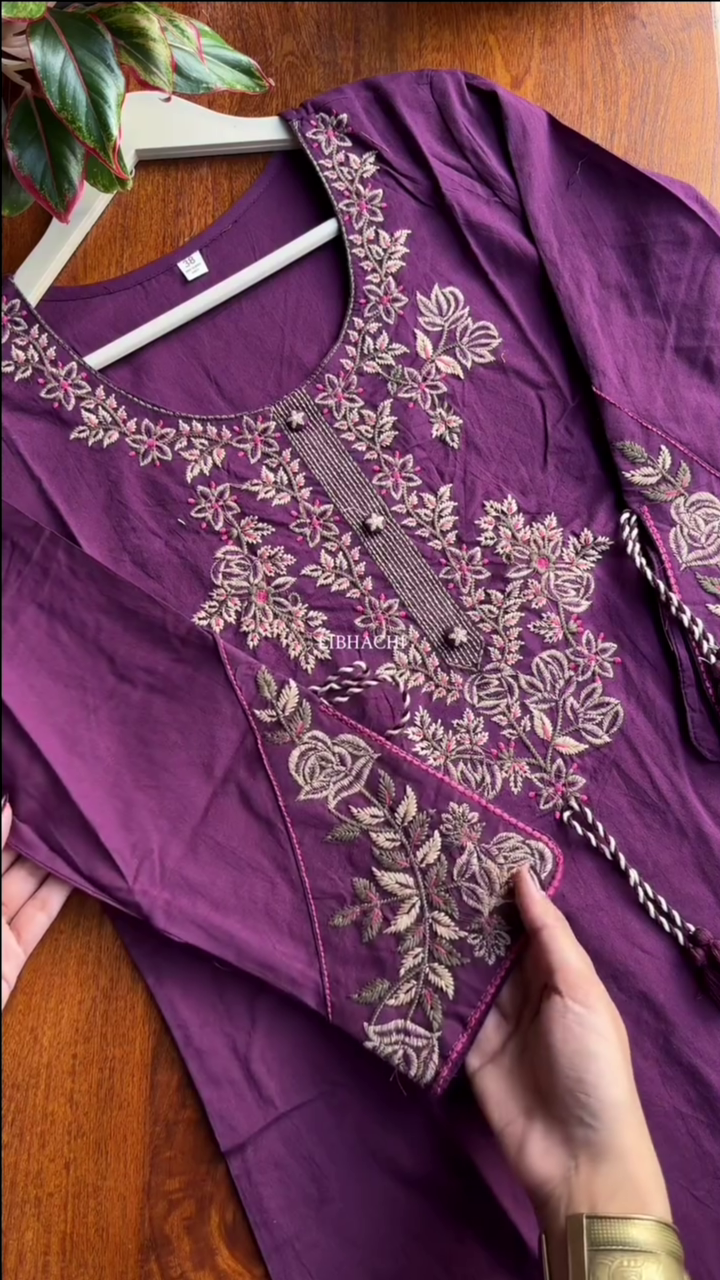 Our 3-piece purple Cotton blend kurta set features a straight-fit design with a round neckline, regular sleeves, and a statement yoke. Complemented with straight pants with a partially elasticated waistband and 2 pockets, and an embroidered dupatta. Adorned with embroidered accents, this style is perfect for festive wear.